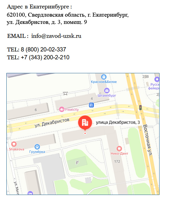 Наши контакты Информационно-сервисное представительствоАдрес: 724408, Кыргызстан, Чуйская область, Кара-Балта, квартал Ковровщиков, 9E-Mail: info@zavod-uzsk.ruТелефон: Время работы:ПН — 09.00 — 20.00ВТ — 09.00 — 20.00СР — 09.00 — 20.00ЧТ — 09.00 — 20.00ПТ — 09.00 — 18.00СБ — выходнойВС — выходной